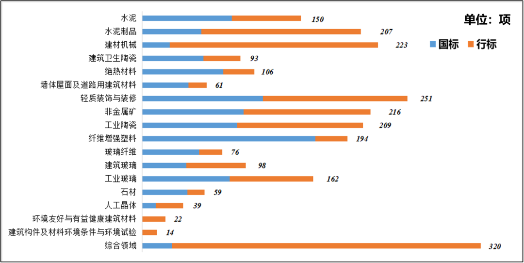 截至2024年底,建材行业现行有效的推荐性政府标准总数2500项,其中,国家标准1073项、行业标准1427项。各专业领域现行有效的推荐性政府标准情况见图1。