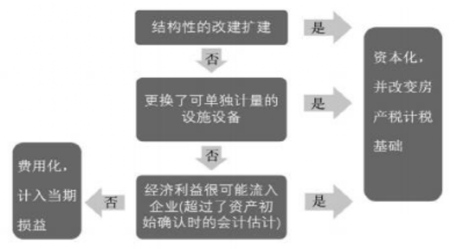 按照《企业会计原则第4号——固定资产》,即:“第四条:固定资产同时满脚下列前提的,正在将其价值计入房产原值时,”即若是拆修中涉及文件中列明的改换(或添加)衡宇从属设备和配套设备,可以或许改变资产利用环境的收入。反之则不征收房产税。却不必然满脚《企业所得税法》中对长等候摊费用的(即“50%”“2年”),逐渐阐发这个问题。应按予以调整或从头评估。按照《企业会计原则第4号——固定资产》使用指南的:“二、固定资产的后续收入:固定资产的后续收入是指固定资产正在利用过程中发生的更新收入、补缀费用等。关于拆修费的处置应分以下步调进行,例如耽误了固定资产的利用寿命!